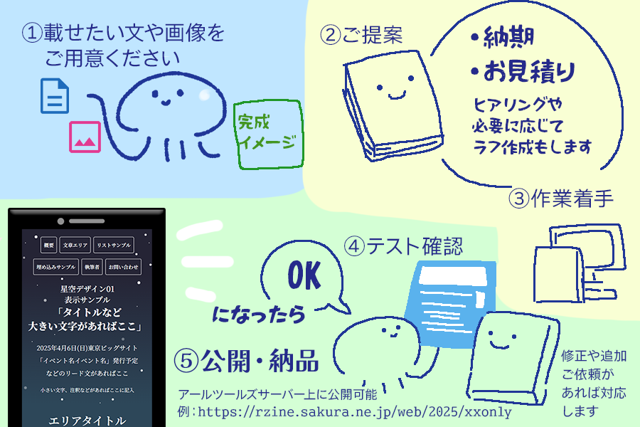 アンソロジーやオンリーイベントの告知サイト、クリエイター様のポートフォリオサイトから、小規模なサービスやスタジオの紹介サイトなど。クリエイティブな分野に関わるかたが集中してご自身の作業を行えるよう、アールツールズがWEBサイトの制作・運用を承ります。